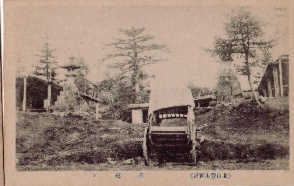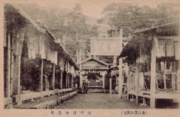 | されている。右の図6〜8は3合目の茶屋で、このあたりで昼食をとる時間帯になったようで、中食堂と呼ばれていた。図6は図7中央奥の神社裏から茶屋を撮ったもの、図8の右側茶屋奥に遠くの山が右下に下っている様子が見える。当時はこのように見晴らしが良く、眼下に河口湖などを一望できたようだが、現在は手前の樹木が伸びて視界は悪い。 | ![]() |