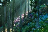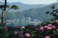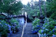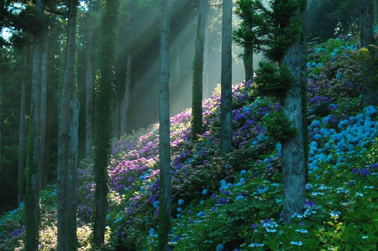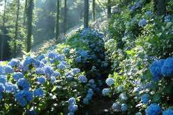 水明荘の手前を右に曲がると車はようやく水平になり、手前になだらかな山道が続いている。くねくねした山道は車1台ギリギリの幅しかない。前方を見ていないと、急斜面に転落しそうな道だが、右下、林の間に静かに澄んだ湖面が広がっている。後方に湖面が隠れる頃、護国神社の赤い鳥居の前に出る。車2〜3台の空き地がある。 護国神社から上は一面ブルーとピンクのアジサイがビッシリと斜面を埋め尽くしている。北斜面の早朝はゆっくりだ。護国神社の階段を上る頃、まだ、陽は頭上はるか先を走っている。参拝後左手のゆるやかな散策歩道を一歩入ると、透き通るブルーが顔面に広がり立ち止まらずにはいられない。少しひんやりする空気を押し広げて、遅い陽光が差し込んでくると、ブルーはいっそう輝きを増す。やや先には今まで目立たなかったピンクの斜面が浮き上がってきた。 アジサイと会話しながらの散策は、時間がいくらあっても足りない。さっきまでうっすらとしていた斜面は、見る見るうちに明るいピンクとブルーで燦々と輝く花畑に変身した。 |