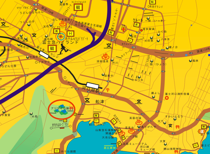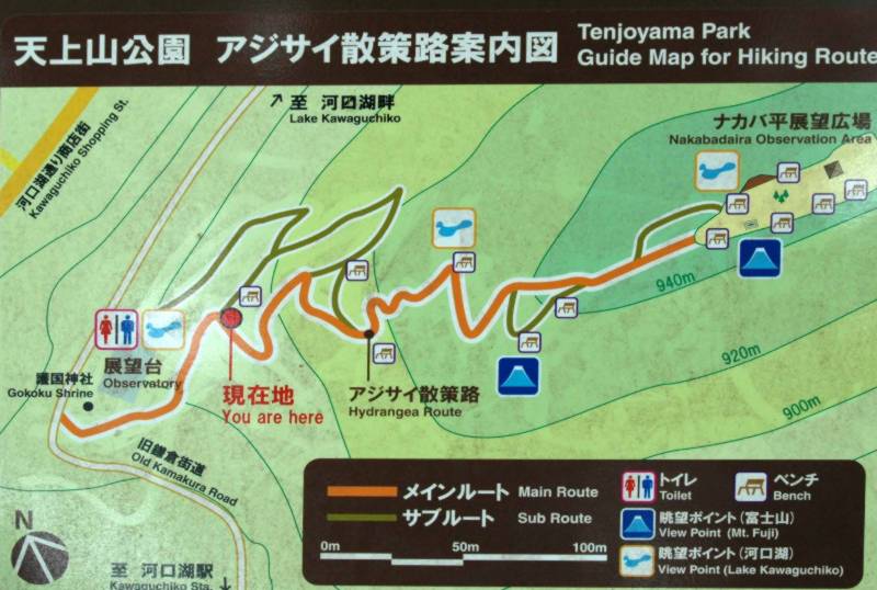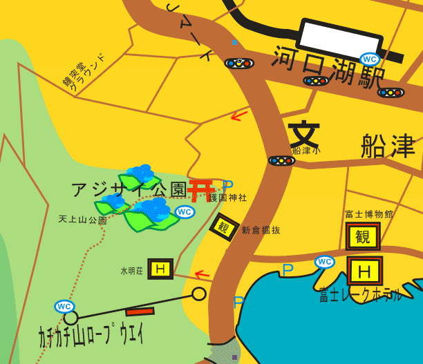 | やがて途中の平らな広場に出る。後方にはピンクの垣根の向こうに静寂な湖面が広がっている。広場の向こうには、夏の一糸まとわぬ富士山がそびえている。なぜかホット一息するほど緊張していたのか、しばらく富士を眺めてたたずむ。親子連れもブルーの垣根の向こうにある富士を眺めてたたずんでいる。あまりにも贅沢な天気と景色に戻るのがもったいないひと時が過ぎていく。少し足を延ばすとロープウェイの富士見台駅に出る。 最近アジサイ公園と呼ばれているが、本当にそれにふさわしいアジサイの花庭だ。足場も良く整備されているので、ゆっくり散策にふさわしい見所の一つだろう。 ところで、「あたまを雲の上に出し・・」で始まる歌と言えばごぞんじ「ふじの山」だが、その作詞者巌谷小波の句碑がアジサイ公園にある。(写真左下)「秋晴れや富士明に水鏡」氏が昭和4年当地を訪れたとき詠んだものだ。(出典:富士河口湖町発行「古の小径」P50)ナカバ平展望広場には太宰治の句碑もある。ちょっとした文学散歩の気分も味わえる。 (近くに駐車場はないので、浜の無料駐車場に駐車して歩くのが良いだろう。徒歩でゆっくり15分もかからないと思う。ロープウェイに乗って上から下るのも良い方法かも知れない。しかし、ロープウェイの駅はナカバ平展望公園からさらに上に2倍ぐらいの距離を登らなければならない。サンダルやハイヒールの場合はロープウェイ経由は無理がある。) このページの写真や記事は2007年のものです。2009年7月7日見頃でしたが、お出かけの際は富士河口湖町役場などにご確認下さい。下は2009年公園内の案内板(上)と周辺地図(下)です。 |