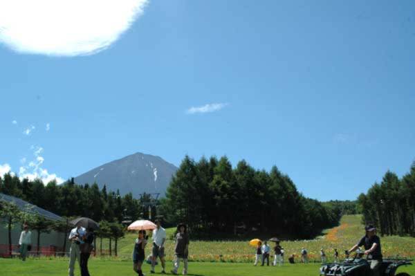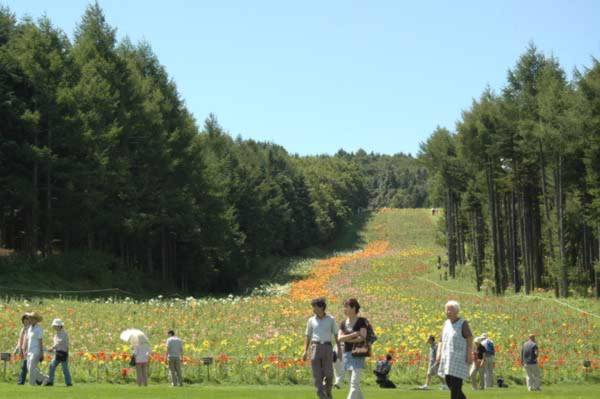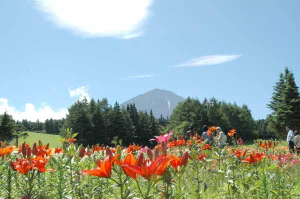 リリーパークは600万輪のユリが咲き誇る富士山麓の広大なスロープだ。どうしてこんな広大なスロープがあるのか不思議になるが、冬に訪れた人は納得できる。なぜなら、ここは天神山スキー場なのだ。そのスロープにいっぱいの赤や黄色、ピンクのユリ、ユリ、ユリ。富士山を拝みながら、ユリの園を散策していると別天地にいるような気分になる。色々な蝶が花から花に舞い渡っているのも楽しみだ。 | |||||||||||||