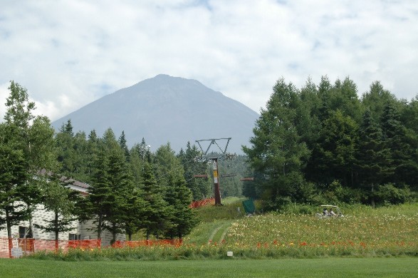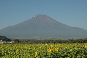 四季折々に季節の花を楽しませてくれる山中湖花の都公園。2007年8月中旬の今ヒマワリが満開で、写真のように富士をバックにすばらしい景観を披露してくれる。(12日撮影)