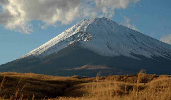 | 須走から御殿場に入り、富士サファリパーク方面に向かう。途中にススキの大草原を走る。富士山と大草原の景観は絶景だ。道幅が狭く、車を止めるところが少ないが、路肩にちょっと空きがあるところで停車する。ススキの背が高く、降りてみると意外と富士山が小さく見える。手前のススキが低い場所を探して歩く。なんとか富士山が裾野まで見渡せる場所でパチリ。宝永山が真正面だ。 隣で「あの大きな穴はなに?」思わぬ質問だ。「あれが宝永山だよ。山頂火口より大きい噴火口の跡だよ」「へえー」と言う顔をしていた。 でも宝永山ってどこのことだろう?口に出さないで自問していた。後で地図で調べてみると、宝永山は右の写真の大きな火口の右に雪のない三角形の頂点の場所がある。 |
