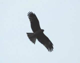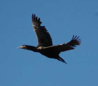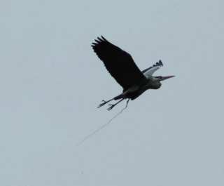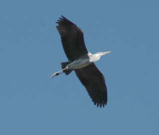 | ←トビ:ここには通年でたくさん生息しています。タカ類に属するので良く見ると鋭いくちばしをしています。同じ木にたくさんとまっているので黒い花のように見えます。あまりきれいではないですね。水鳥ではないので、周りの電線や木にとまっています。「トンビがくるりと輪を描いた」と歌われているようにいつも何羽かが上空をくるくる飛んでいます。 ←アオサギ:飛翔しながら糞をしています。撮影中も上空からの糞で車は白く汚れていました。まさか、ねらってはいないと思うのですが・・・ |