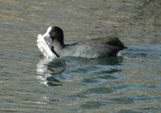 | オオバン:オスメス同じ外観のようです。今年の定期調査で観察されたガンカモ類の合計よりオオバン1種類の方が多く観測されています。警戒心が少ないのか、かなり近くでスイスイ泳いでいます。写真は撮りやすい野鳥です。 | |||||||||||
