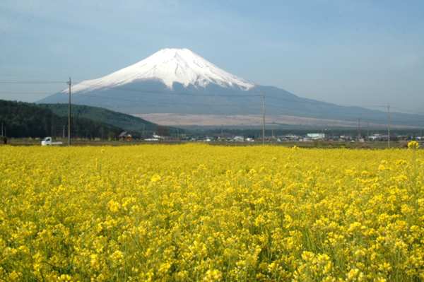 「時知らぬ山は富士の嶺いつとてか鹿の子まだらに雪の降るらん」(伊勢物語)と歌われているようなまだら模様の山肌が薄青い空に溶け込んでいる。目を凝らしてよく見ないと、あの大きな富士山を見失いそうだ。 午前中、ダラッと垂れ下がっていた鯉のぼりが、午後、大空に泳ぎ始めた。五月晴れと言うより春霞の一日。富士北麓は花と新緑が真っ盛りだ。 昨年オープンして予想を大幅に上回った入場者の「富士芝桜まつり」は、今年も好調だ。駐車場からのでこぼこ道に一抹の不安を感じるが、会場の芝桜を見たとたん誰もが感嘆の声を上げ、カメラを向ける。2.4ヘクタールに70万株の芝桜は圧巻だ。ピンクと白のじゅうたん。樹海の緑、その先に紺色と白の富士山が青空の下に収まっている。 一方、山中湖花の都公園では、赤と黄色のチューリップが富士に負けじと咲き誇っている。また、忍野村内野では、菜の花が満開だ。観光用ではないと思われるのでほんの一角だけだが鮮やかな黄色は感動的だ。 人工的なコントラストの強い花々と対照的に、自然の木々の新緑は枯れ枝の中からもやもやと湧き上がってくるようで新鮮だ。落葉樹の新芽が、林の中を優しく薄黄緑で包み込んでいる。逆光の中で、この緑は怪しいまでに美しい。花粉もやや治まってマスクなしで晴天を楽しめる機会が増えた。 五月晴れの中、富士北麓は花と緑を自由に組み合わせて楽しむことができる。もちろん鹿の子まだらの富士も、日ごとに変化して飽きない。明日はどんな富士だろうか。五月の晴天に感謝。