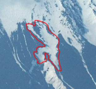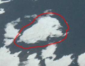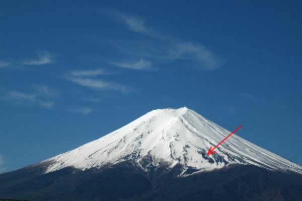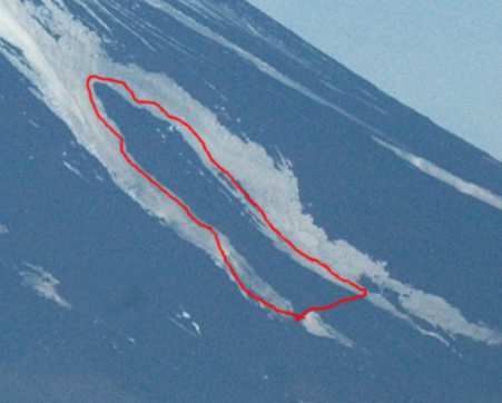 富士の鳳凰の雪形は農鳥の前に現れる。まだ、残雪が多く、強い西風で斜面の雪が飛ばされ溶岩の流れ落ちた跡が白と黒の羽のように広がり、鳳凰が山頂めがけて舞い上がる様子が出現する。左の赤丸の写真だ。黄色の丸は「泳ぐ子くじら」 |