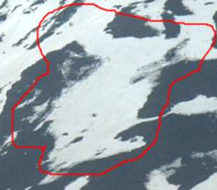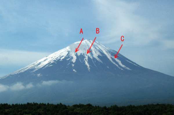 | 鳴沢の雪形「あかちゃん」「農爺」「かんのんさま」 2009年6月2日撮影(鳴沢村) 以前に鳴沢村の雪形「農爺(のうじい)」が出現すると聞いていた。しかし、どこに出るのか、毎日見ていてもなかなか分からない日が続いた。ところが、先日いつもの場所から観察していると、なんとなんと色々な「雪形」が現れた。右のABCがそれである。拡大してみると下のようになる。AとCは筆者が始めて名づけるものだと思うが、Bの農爺は古くから伝わるものではないかと思われる。村役場のある課長さんは「武者にも見える」とおっしゃっていたが、そう言われると剣を持った太古の武者にも見える。全てイメージなので見る人によって変化があるだろう。 |