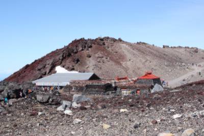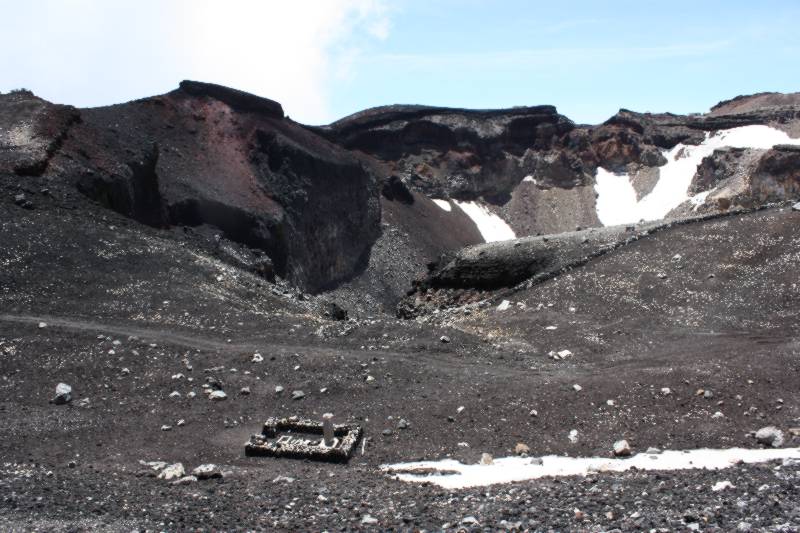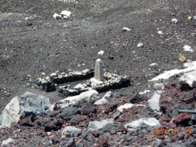 | 吉田口登山道山頂にある久須志神社から左回りで進むと、すぐに右下のような広い場所にでます。久須志神社と大日岳の間の広場です。右側には頂上の噴火口が大きな穴を開けています。噴火口の対岸には最高峰剣ヶ峰が見えます。後を振り返ると久須志神社が小さく見えます。(右上の写真) 大日岳の外側を剣ヶ峰に向かいます。伊豆岳、成就岳を抜けて銀明館にでます。 御殿場口の山頂です。ここには銀明水と呼ばれる水場があります。 |