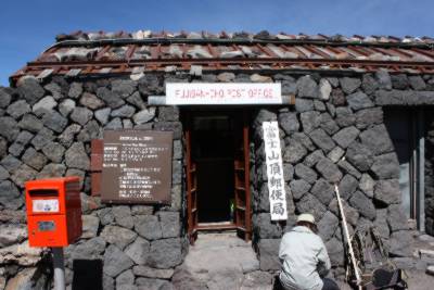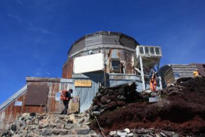 | 銀明水を過ぎると浅間大社奥宮につきます。富士宮口登山道山頂です。ここには夏の間は郵便局もあります。 三島岳を過ぎるといよいよ最高峰剣ヶ峰です。 その前に馬の背と呼ばれる急坂を登ります。頂上の建物は富士山レーダーのあった富士山頂気象観測所です。現在は無人で気温、気圧などの観測が行われています。また、空いたスペースを「富士山高所科学研究会」が借り受けてさまざまな研究に活用しています。 最高地点には石柱が建っています。(一番上の写真) 剣ヶ峰を過ぎると大沢崩れの上部、白山岳を通過し久須志神社にもどります。 白山岳の下に広がる広い場所にポツンと金明水があります。 |