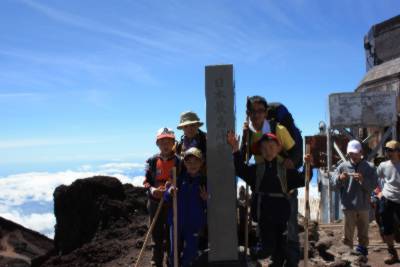 | 今年2010年の海の日の連休は快晴にめぐまれ富士登山に最適でした。昨年は風がひどく、写真を撮るどころでは無い悪天候でしたが、今年は左の写真のように孫たちも無事剣ヶ峰で記念写真を撮ることができました。 できるだけ風景を撮ってとたのんでいた写真も、たくさんできたので、その写真を使ってお鉢巡りを紹介します。 |
