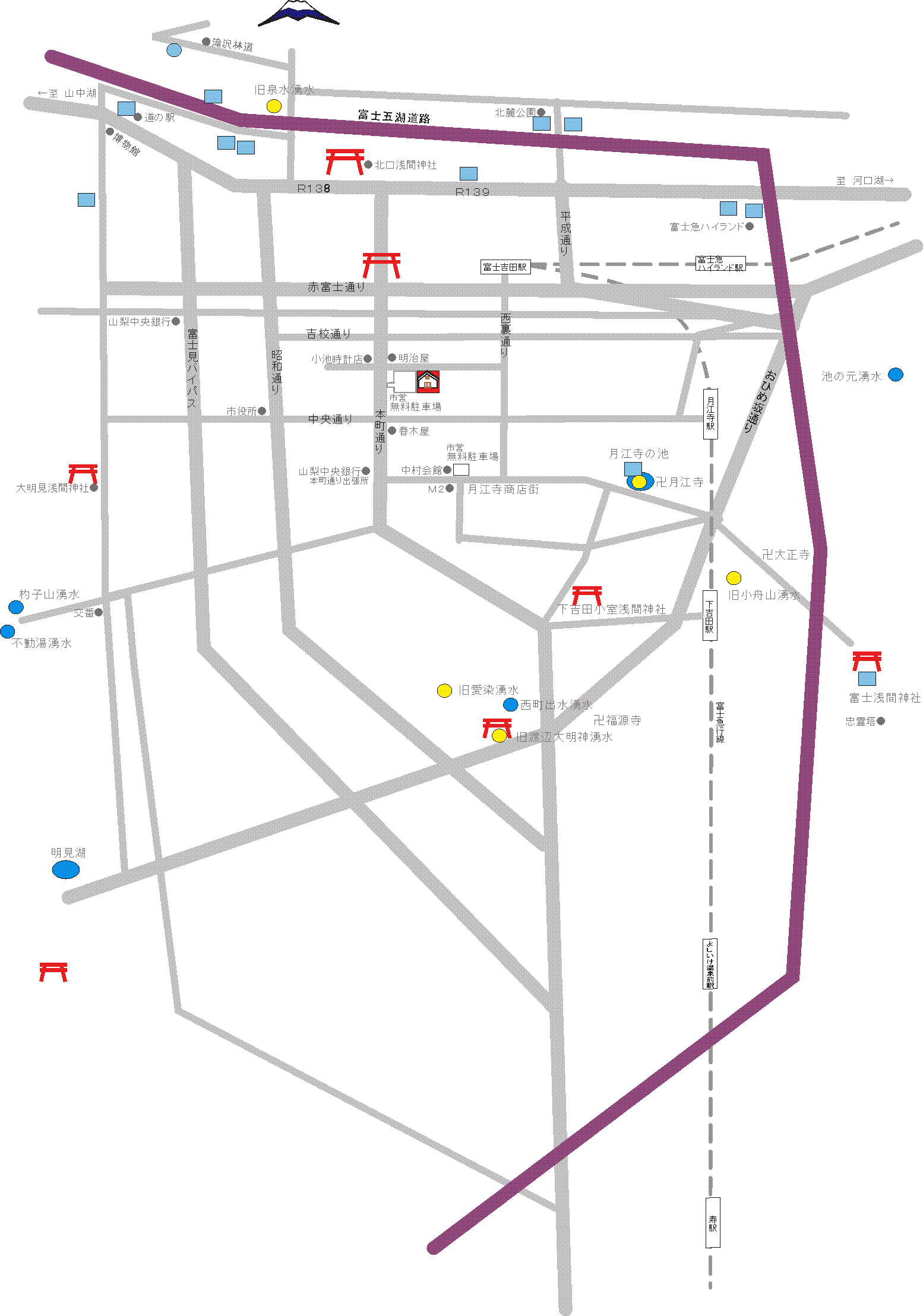 | 左の写真は現在の月江寺の池です。注ぎ込む水はありますが、昔を知る人の記憶にある豊富で鮮烈な水ではありません。 それもそのはず、昭和後半に自然の湧水は枯渇し、現在は井戸を掘ってポンプアップした水を流す、人工の池となっているからです。 昔のきれいな池を復活したいという周辺の人たちの努力と市の協力によってなんとか池を維持しているといえます。 このような枯渇した湧水は他にもあります。 新町水道の水源であった「小舟山水源」、染色に使われていた「愛染の湧水」、豊富な水量をほこった「渡辺大明神の裏手の湧水」、宮川沿いに多数湧出していた湧水郡、鎌倉時代から続いていた「泉水」などです。 富士山から富士吉田の扇状地の中心にあるのが特徴です。 一方山沿いにある湧水は現在も健在です。 富士吉田市の東にそびえる杓子山の中腹にある「不動湯の湧水」、ここと沢一つ違いの崖から流れ落ちる「杓子山の湧水」、水量はごくわずかながら江戸時代にはあった「池の元の湧水」、富士八湖の一つ「明見湖」、富士山としては珍しい標高1500m付近にある「滝沢林道の湧水」などです。 |