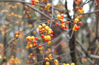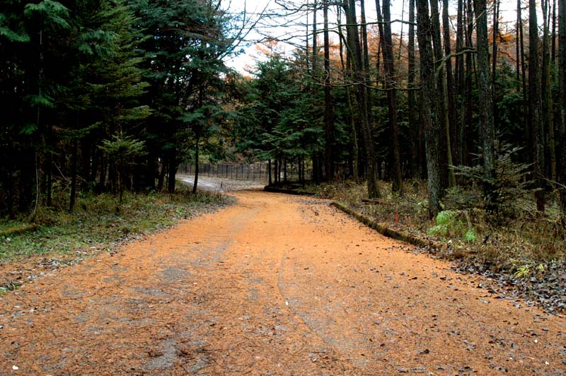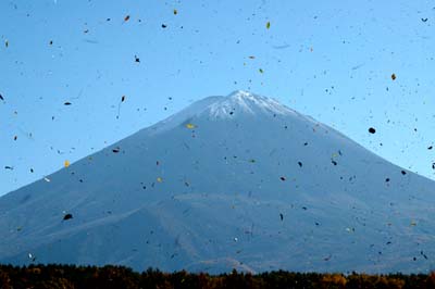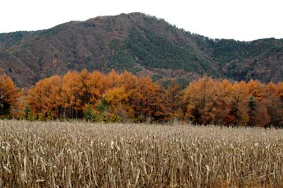2010年11月23日朝、雨上がりの曇りなのに暖かい。国道139号勝山の温度計は10時で10℃でした。 鳴沢村の大田和の信号から五湖台方向を見ると、まだ紅葉が残っています。(右の写真)でも、上を見上げると木の葉はだいぶなくなりました。(右上から2枚目) 今月11月9日は風が強く、まだ紅葉真っ最中でしたが左の写真のように落ち葉ならぬ「舞い上がる枯葉」が富士山を覆い隠していました。 こんな富士山もあまり見ない光景ですね。 23日はカラマツの落葉がすごく、左のように舗装道路が茶色く塗りつぶされてしまいました。よく見ると上のタイトルのバックのように短い紅葉した松葉がびっしりと敷き詰めていました。 下を歩いていると頭上からは絶え間なくカラマツの松葉が落ちてきます。髪の毛やセーターに絡まるので、傘が欲しいほどでした。 左下は枯れたトウモロコシ畑とカラマツの紅葉、バックは五湖台です。こんな枯れた風景もきれいですね。 枝だけになった木々の中には右のようなきれいな実をつけるものがあり、目を楽しませてくれます。 晩秋の鳴沢もきれいです。 富士山に雪形も現れ、冬ならではの楽しみも方もたくさんある富士北麓で熱いおナベなんていかがでしょうか。 |