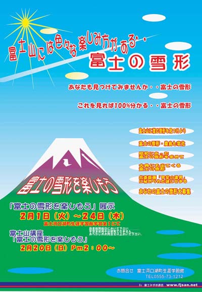 | 富士みずほ通信はWEB上での発信内容をできるだけ実際の展示などで発表したいと考え、オフ展を断続的に開催してきました。 今月は二つの展示会を開催します。 一つは富士河口湖町生涯学習館のご好意で取り組んでいる平成22年度富士山講座と展示会です。平成23年2月1日〜24日は第四回富士山講座として「富士の雪形を楽しもう」展を開催しました。(左のポスター) 二つ目は富士吉田市のイベントホール大津蔵で2月23日〜27日まで開く「富士山の日富士五湖写真歳時記展」です。 「富士の雪形を楽しもう」展では、冬の富士山に降り積もった雪が形作る色々な模様を紹介します。 初夏、田植えの時期に現れる「農鳥」が有名ですが、真冬に現れる「鳳凰」や、漫画家の前田康成さんが命名した「ふう爺さん」など、12月から7月まで、富士五湖のそれぞれの場所から見ることができる色々な雪形を写真で紹介します。 また、平安時代から今日まで語り継がれている雪形についても紹介しています。 「富士五湖写真歳時記」展では、富士五湖周辺の各地で行われている色々な行事を1月から12月まで写真で紹介します。 こちらでは祭事にあわせて、富士山の様子や自然の草花などもあわせて富士五湖の四季を60枚以上の写真で紹介する予定です。お茶を飲みながら歓談できたらいいなと考えています。 ぜひ大勢の方のご観覧をお願いいたします。 |