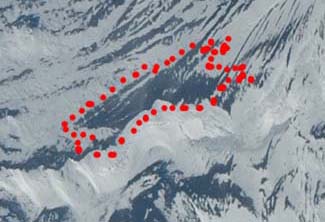 3月19日撮影、富士山はやけにくっきりしています。上は鳴沢村から見た富士山です。 画面中央のやや左に「うさぎ」の雪形(ネガタイプ)が現れました。 反時計回りに90度回転すると左の赤い点線のようになります。 この雪形は3月21日から22日にかけて降った雪で消えてしまいましたが、雪が融ければ、また現れるでしょう。 |