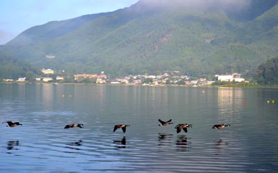 | 2011年の9月もアッと言う間に中旬に入ってしまった。 ひがな仕事と孫の追っかけに追われつつも写真機だけは離さずあちこちでパチリパチリと撮りまくっている。今回はそんなショットから紹介する。 1 左上(快晴の空に虹が出現) 9/8快晴、西日が車の中まで射し込み孫を待っている間も真夏のような暑さ。そんな時周りの父兄や帰宅を始めた子どもたちがみんな空を見上げてなにか叫んでいる。 「虹だよ!」「虹が出ている!」 車から出て上空を見ると半円形の虹が出ている。雨もなく虹なんてちょっぴりとも考えられない快晴の青空の虹はすぐに消えてしまったが、カメラを取り出しパチリ。 それが左の写真だ。下の街灯は鳴沢小グランドの夜間照明灯だ。 最近、富士山の周りでたまに快晴の空に短い虹が出るのに出くわす。 その中で、今回の虹は大きくてくっきりとしている。 なんとなくラッキーな気分にさせてもらった。 2 クロアゲハかはたまたアゲハモドキが 写真左中は我が家の庭のホトトギスの花に飛来したチョウの写真だ。ホトトギスは蜜が豊富なのだろうかチョウや蜂などが良く飛んでくる。 その中でも優雅に蜜を吸い渡っているのが左の黒いチョウ?だ。 多分クロアゲハだと思うが、この辺にはアゲハモドキとかのガもいるのでどちらかだと思う。どちらにしても気品のある黒のチョウ?が優雅に舞っているのを見ていると気持ちが安らぐ。 鳴沢の我が家は林の中で蛇やトカゲ、カメムシにカマドーマ、最近は多分山のネズミなどがたくさん訪れるが、黒いチョウの訪問は喜んで迎えたい訪問者だ。 3 カナダガンの朝の飛翔 左下の写真はカナダガンの飛翔の様子だ。カナダガンは河口湖に留鳥として定着している大型の野鳥で、餌付けされているので人を怖がらない。 |