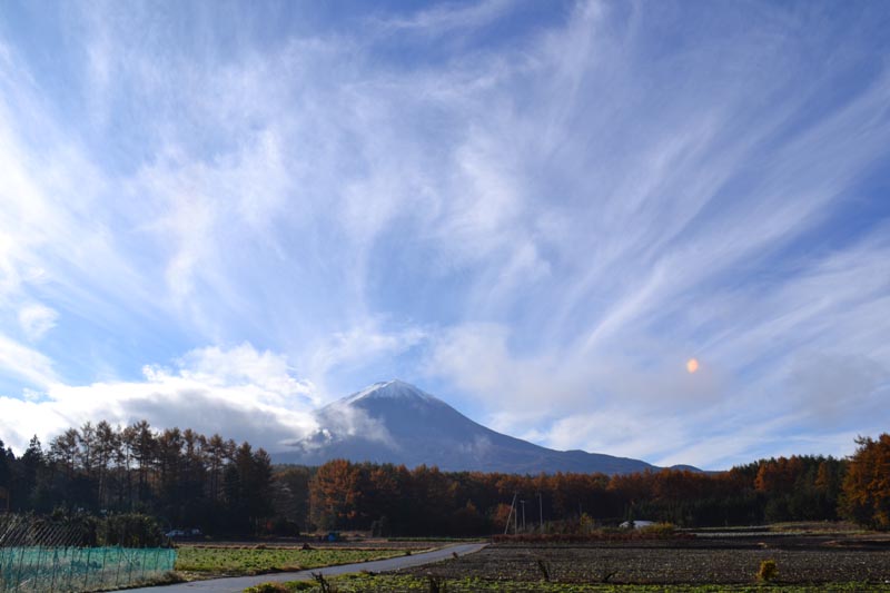 河口湖北岸で開催されている紅葉まつりの期間も11/20までですので、今年はまだと言う方は是非この週末紅葉狩りにお出かけ下さい。(ちょっと天気が不安ですので、早い方が良いかも知れません) 冷えたと言えば11/16鳴沢村では6時氷点下でした。 たがやされた畑には左の写真のように一面真っ白に霜が降り、カラマツなどの紅葉ときれいなコントラストを見せてくれました。 今年の11月前半は暖かな天気がつづきました。家の近くでは久しぶりに鹿の姿を撮ることができました。 暖かいと放射状の雲も撮りました。珍しいので左下に載せました。 急な冷気は身体にはきついので風邪など引かないような暖かい服装でお出かけ下さい。 |