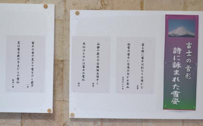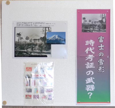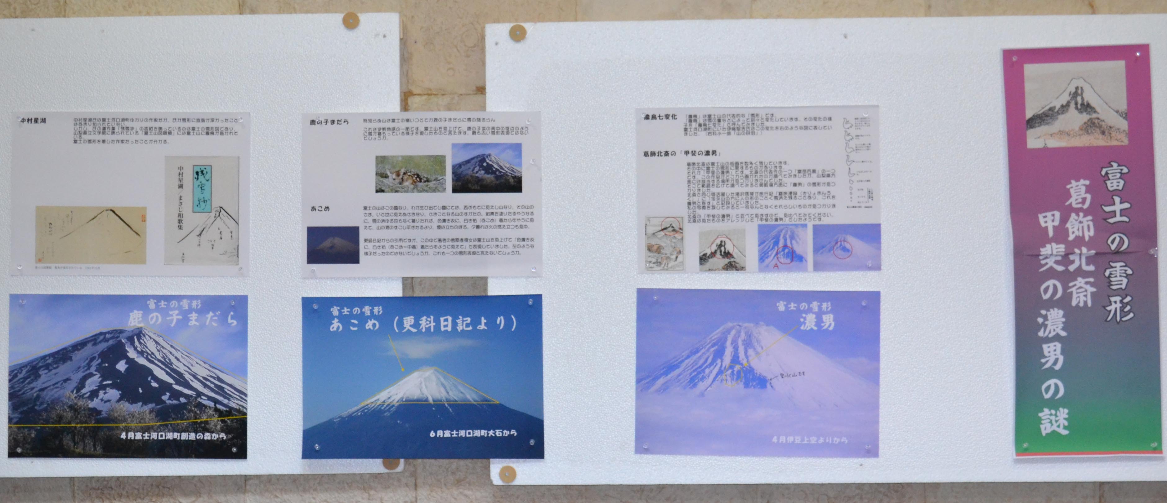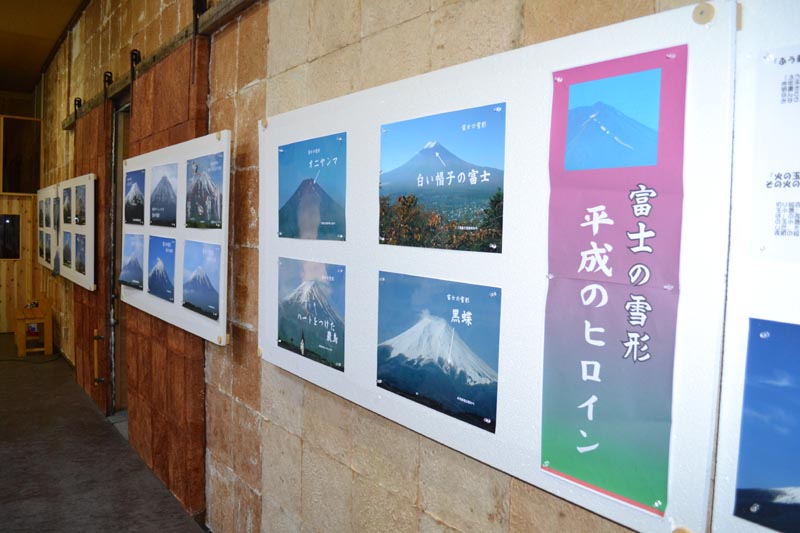 | 2011富士の雪形展は富士吉田市の大津蔵で10月9日と10日両日開きました。 また、同時開催セミナーとして9日「富士の雪形勉強会」、10日「徐福勉強会」が開かれ両テーマに興味を持つ熱心な方々が延べで100名余ご来場いただきました。 雪形展では1 農鳥七変化、2 詩に詠まれた雪姿、3 葛飾北斎甲斐の濃男の謎、4 時代考証の武器、5 平成のヒロインの5テーマに分けて展示しました。 雪形展を見ていた人は吉田大沢の火炎仏を見ながら「うちの方では牛の角と呼んでいる」などと、古くから別の見方で伝承されていることを話題に盛り上がっていました。 今回の雪形展は毎日新聞で予告記事として取り上げていただいたこともあり、遠方からの来場者もありました。また、遠く新潟県の方からも照会があり、関心の高さが感じられました。 |