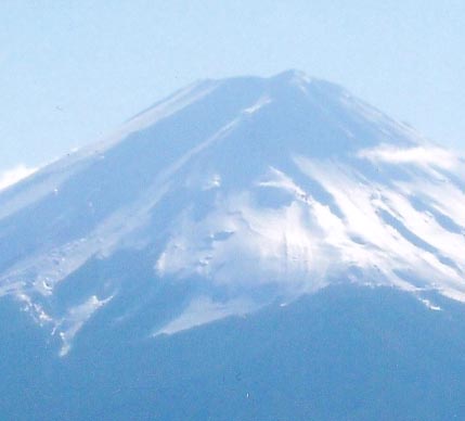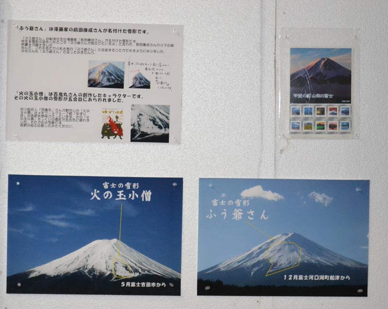| 真紀徳氏の富士の神鳥は山中湖方面から山頂を見たとき山頂右側のすぐ下に最後まで残る残雪です。7月上旬滝沢林道途中から良く見えますので興味ある方は来年観察して見てください。 山中湖からも見えます。(今回会場入り口に展示させていただきました。) もう一人は2008年正月に山梨日日新聞でも紹介された「ねずみ」の顔の雪形写真を持参していただいた渡邉典夫氏です。 (写真右下)わざわざ韮崎市から駆けつけてくれました。今回は展示できませんでしたが、次の機会には展示させていただきたいと思います。 これはお昼過ぎぐらいでしょうか、御坂峠の展望台からの撮影です。我と思わん方は今年の真冬にチャレンジしてみてはいかがでしょうか。 |