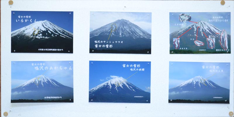 | 今回は富士の雪形の写真を持ち込んでいただいた方が2名いたことも特徴です。 長年富士山を撮り続けている富士吉田市在住の渡邊真紀徳氏はご自身が撮影した「富士の神鳥」(下の写真)をご持参いただきました。この雪形を撮るのに3年かかったとの事です。 (右上が顔、左下に足が2本中央から羽が左右に開いている) |