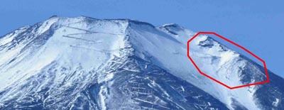2011年11月下旬富士山に 新しい雪形「大猿の 寝顔」 山中湖方面から見た山頂右側の稜線 写真:山中湖方面から見た山頂(11/26) |