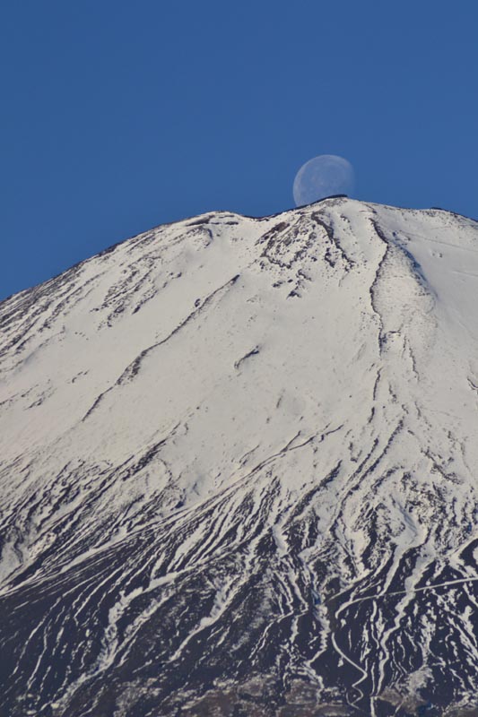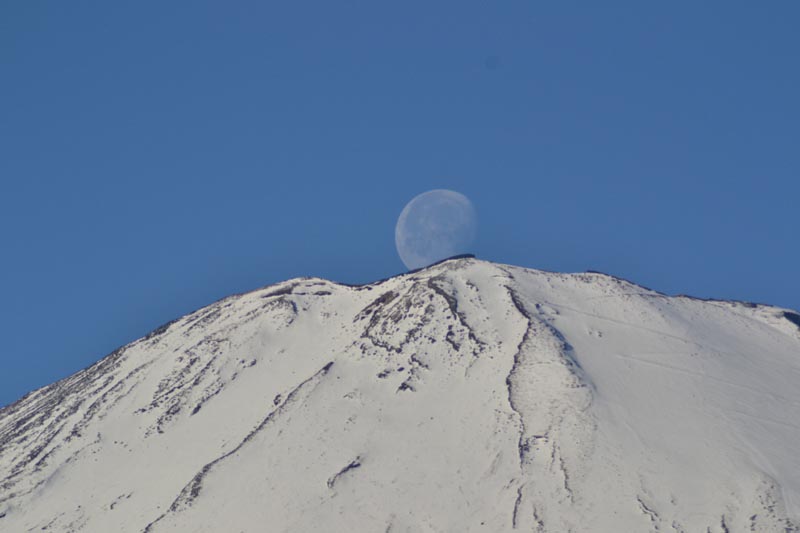 | 今月2月は山中湖畔からダイヤモンド富士を見ることができる月です。 そこで、兄弟なのか、夫婦なのか分かりませんが、ダイヤに対してパール富士があり、それを先月撮影しました。 ちょっと時間がずれていますが、ご覧下さい。 パール富士は月が富士山頂にかかる状態を表現しているそうです。 以前から、このパール富士も一度撮影したいと、満月の夜にチャレンジしました。 ところが、満月の夜、月を写すと富士山は真っ暗になって写りません。 方や、富士山が写るようにすると、今度は月が明るすぎてハレーションのようになってしまいます。 真っ暗な中で富士山頂と月を同時に撮影することはできませんでした。 そして、何回かの試行錯誤の末、月と富士山頂を同時に撮影するのは明け方か夕方に月が富士山頂にかかる時だと言うことが、やっと分かりました。 そこで、今回満月ではありませんでしたが、早朝、月と富士山頂の撮影ができました。 すでに夜は明け、朝の8時近くなっていました。そこで撮れたのが左の写真です。 早朝5時頃鳴沢を出発、御殿場の乙女峠を目安に月を見ながら走りました。 ところが、国道246近くまで進んだところで、月の位置が富士山頂にかかりそうもありません。仕方ないので、今度は枝道に入り、東富士演習場滝が原の自衛隊駐屯地から御殿場口登山道に入りました。 ここは、富士山頂と月を良く観察できるかと考えたのですが、思った以上に木や電線が邪魔をして富士山が良く見えないのです。そればかりか、1月中旬だったので、路面が凍結して、私の車では走れなくなってしまい、冷冷しながらユーターンし、急いで国道138号へ戻り、結局左の写真を撮れたのは籠坂峠の近く、ちょうと須走り浅間神社付近からでした。 なんとムダに車を走らせたことか。 適当に走っても、撮影ポイントにはなかなかたどり着かないものです。 次はもっとゆっくり家を出て満月のパール富士に挑戦したいと思います。 |