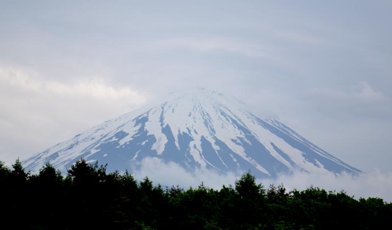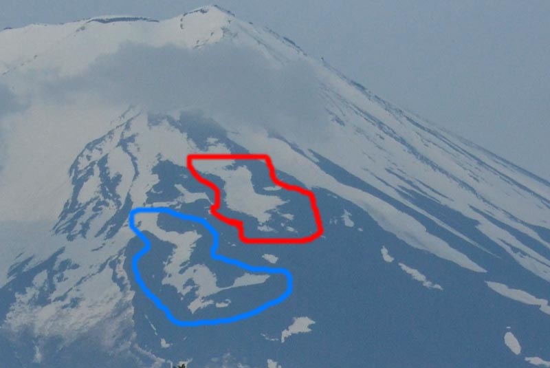 | ところで、上の写真の青枠ですが「竜が登る」姿に見えませんか。5月末もう一羽の「鳥の雪形」が見えた場所です。 ここは雪解けが早いのか、雪形も時時刻刻変化します。瞬間的な形かも知れませんが、どのように変化するのか追いかけてみるのも面白いですね。 右は6月1日鳴沢村から見た富士の雪形です。(鳴沢村総合センター方面から撮影) 左から「赤ちゃん」「農爺」「おたけび」「観音様」が見えます。 なるさわ道の駅から良く見えます。 |