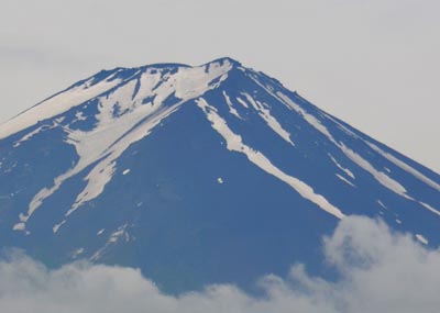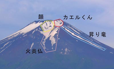 7月1日富士山山開きです。 今年は残雪が多そうですね。気温が上がらないためか、雪形がよく見えます。 左の写真は6月27日富士吉田からのものですが、火炎仏、昇り竜、カエルくん、そして「顔」がクッキリと見えますね。 さすがに「農鳥」は昇り竜の下で点になっています。 報道によると7月1日登山道は除雪によって山頂までOKだそうですが、下山道は雪が深くて使えないとのことでした。 6月30日鳴沢21時18℃、ようやく少し暖かくなってきましたが、1日朝6時は17℃深い曇りです。気温は上がりそうにありません。 富士登山には良い条件ではありませんが、雪形は7月中旬まで楽しめそうです。 今年の6月は富士山見える度※最悪でした。月平均0.9、よく見えた20日でも見える度4でした。 7月なんとか富士山が見えるように祈るばかりです。 |