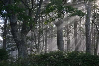 B 朝もやが晴れる頃、林に陽が差し込み射し込みました。