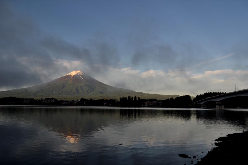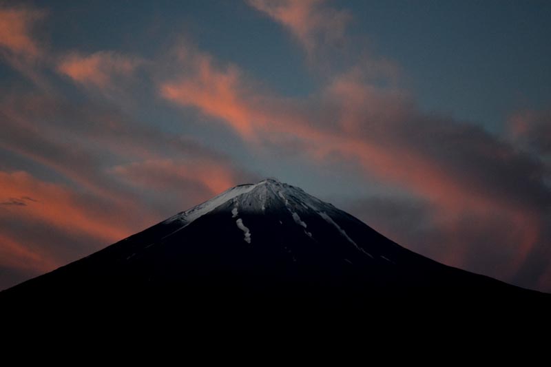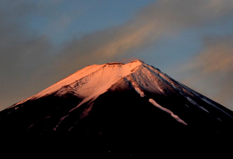 | ↑写真:6月22日早朝4時過ぎ、鳴沢から、バックの雲が朝焼けでした 前夜の雨で、八合目から上は雪化粧でした。 山頂の雪が見えなくなるのは7月中旬、下界は夏でも山頂は冬です。 登山する人は、寒さや雨など、気候変化に対して、しっかりとした装備が必要です。 特に、吉田口の夕方、日暮れは意外と早く、夕方の下山道は真っ暗になってしまいます。 事前の情報をしっかりつかんで、準備しましょう。 |
