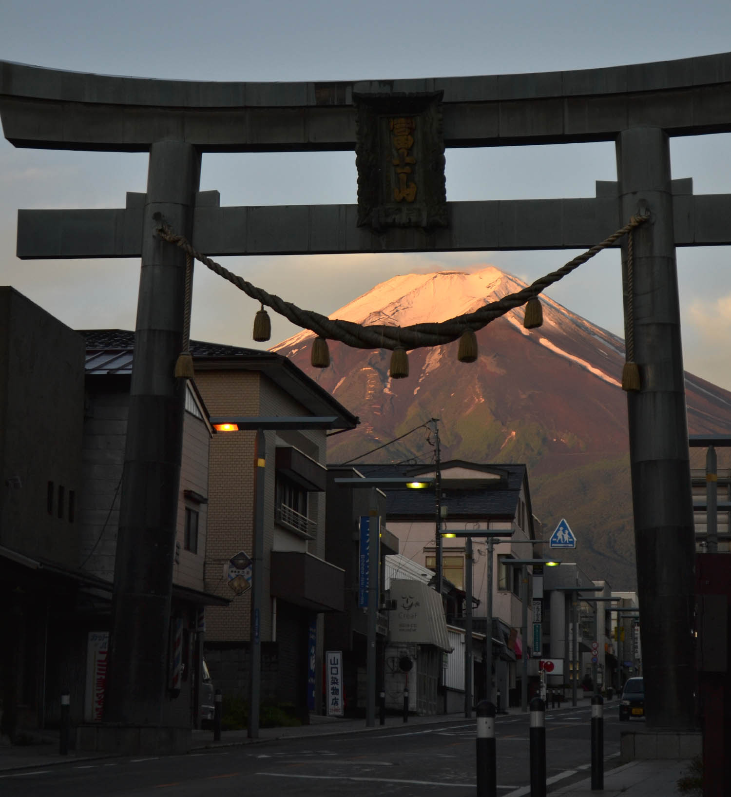 | ↑22日4時半頃 富士吉田市上吉田の金鳥居から 富士急ハイランドから金鳥居に着くと、富士山の赤みは消えて白いいつもの富士になっていました。 |