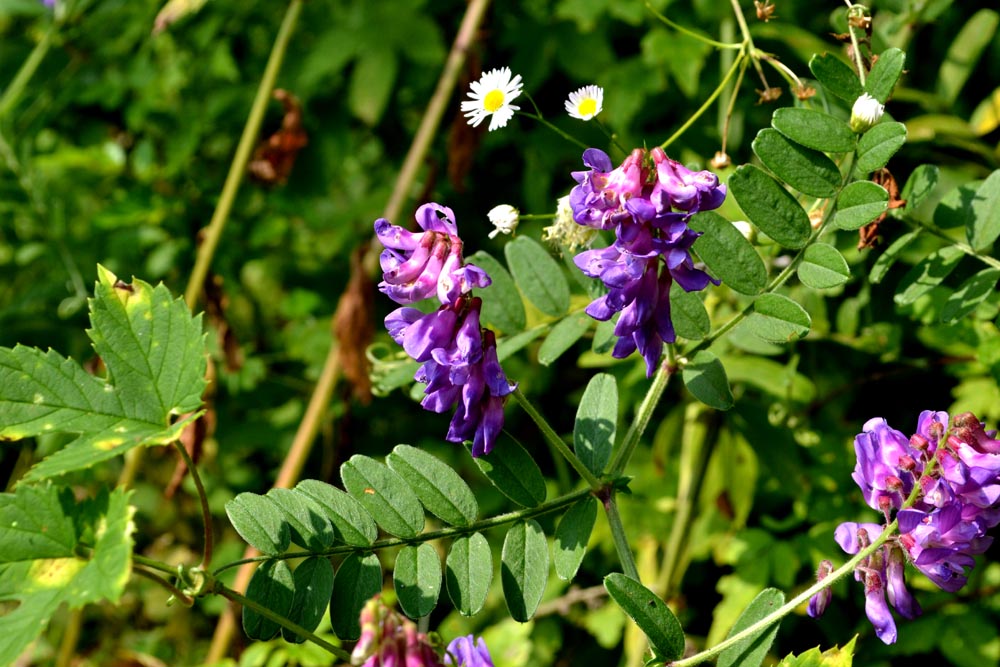 ←クサフジ この花は目立ちます。陽当りにたくさん集まって咲き、花の房も大きいのと色が鮮やかな赤紫ですので緑の中ですぐ目につきます。 ちょっと派手すぎて写真としては面白くないのは私の趣味でしょうか。 なんとなく豆のかななのかなーと思いましたがつる性の野草だそうです。フジの花に似ている野草なのでフジクサと呼ばれているそうです。 |