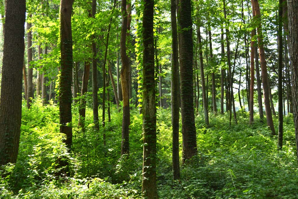 | 我が家の周囲は上のような林です。 富士山の裾野ですので、なだらかに傾斜しています。国道に出るのに自転車で行きは下りですいすいですが、帰りは全て上りでヒーコラで、乗るよりも押した方が早い、そんな場所です。 ここには避暑の他に楽しみがあります。野草花です。 8月中旬の今は少し歩くだけでたくさんの花を見つけることができます。 今回は、その一部を紹介します。日本全国の山野でも見ることができる花だと思います。 |