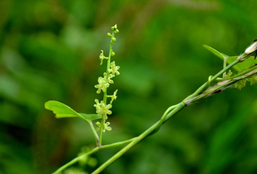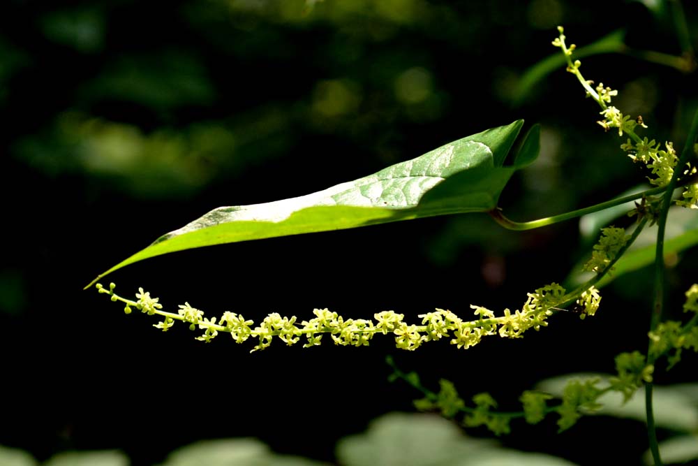 ←オニドコロ(A枚) 小さいがきれいな花がたくさんついた枝が目につきます。色は薄緑色で注意しないと単なる野草で見過ごしそうです。 昔から知られていた野草だそうで、ヤマノイモ(自然薯)の仲間だそうです。ただ、こちらは灰汁が強いそうです。 オニのようなトコロが名前の由来だそうですが、オニは葉が大きいことでオニだそうです。ちょっとかわいそうなネーミングですね。 トコロは野老と書くそうですが、根が老人のような形から来ているとのことです。 昔は正月の飾りつけに用いられたほど利用されていた野草だそうです。 この項は「野の花散歩」 を参考にしました。l |