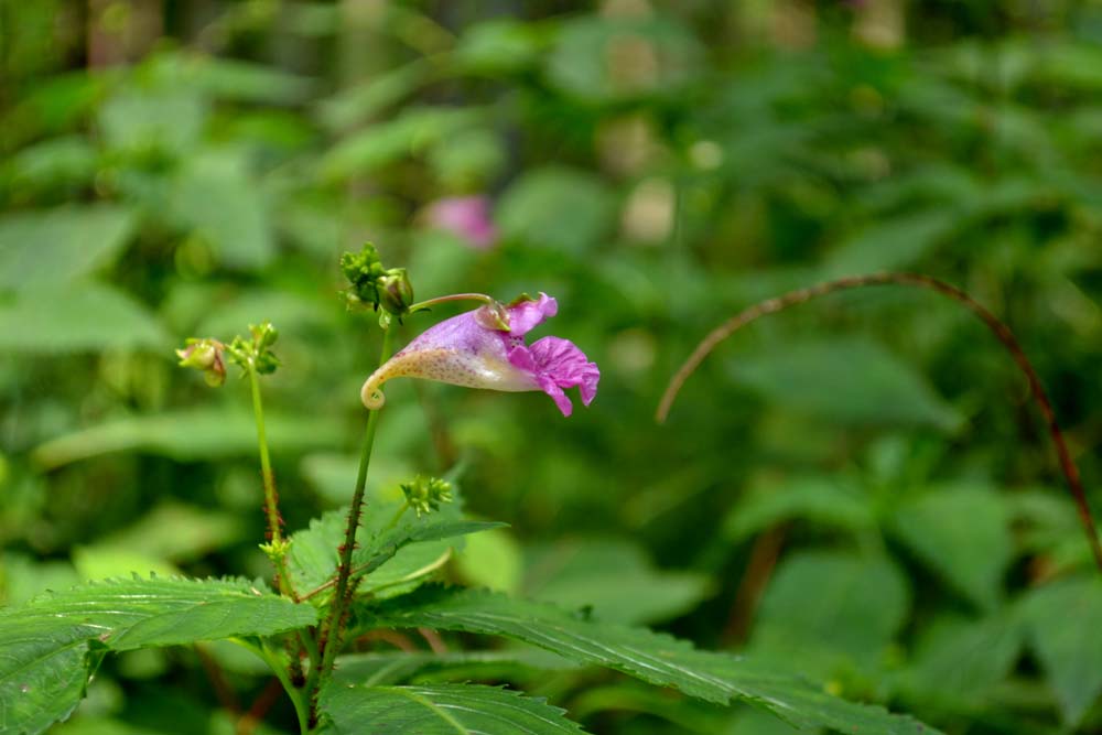| ツリフネソウ→ この花の名前は花を見るとなるほどと納得します。色はきれいですが、なんとなく形はジャングルの中の食虫植物を連想し、今一つ好きになれません。花からすると好きもきらいも関係ないでしょうが。 そういえばこれに似た花でキツリフネもそうですが、花の下側が白く灯りが入るようになっています。 ハチが明るい方に進むと奥の蜜が吸えるしくみになっているようです。このとき花粉がハチについて、花が受粉できるしくみなのでしょうが、自然の成せる業ですね。 |