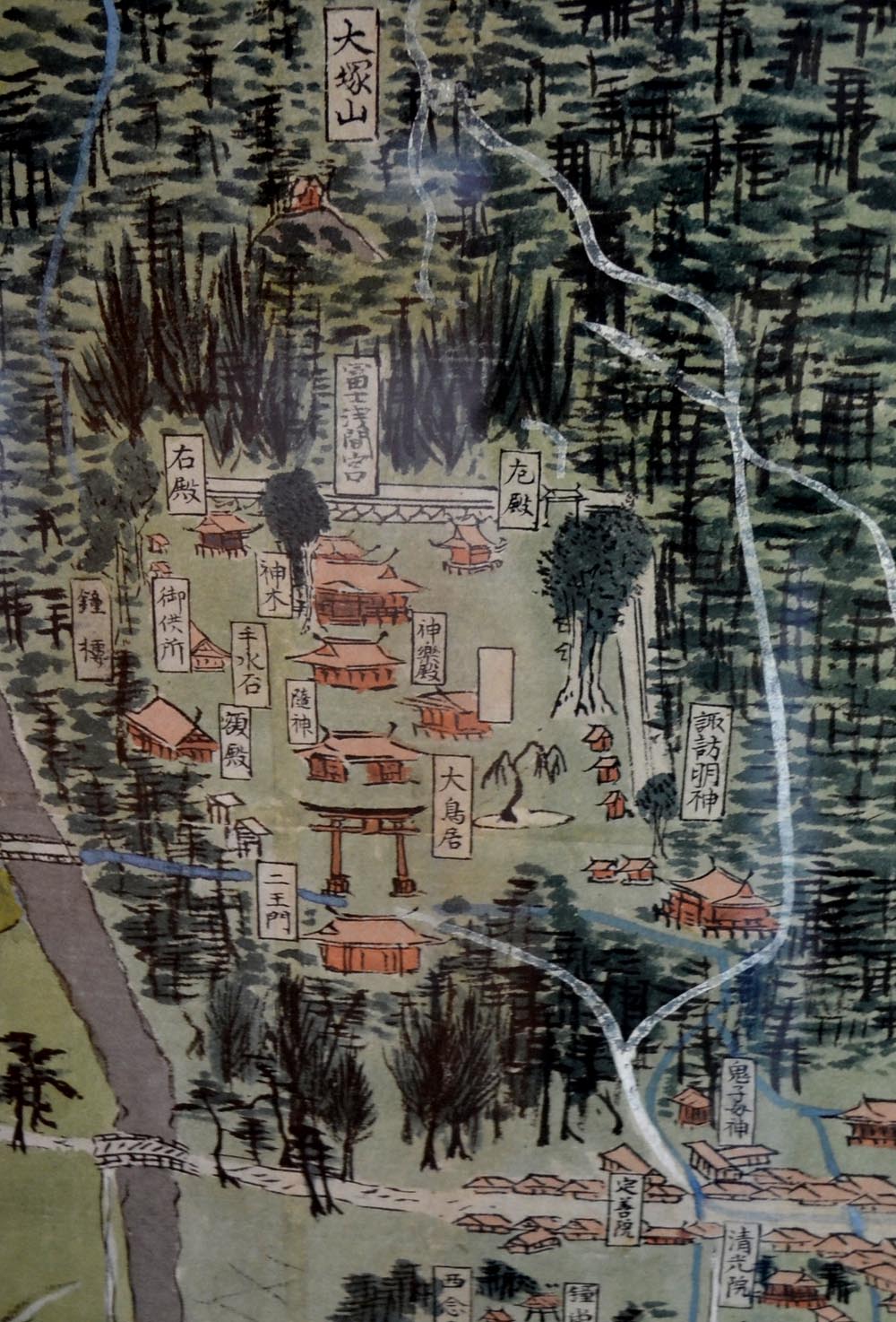 | 絵図に水路が描かれているのも珍しいです。 上図の大鳥居手前の水路が右図の上吉田村中心の参道中央と家の並びの左右に分かれて流れています。 これは福地用水ですが、現在も大鳥居手前を流れて家並みの左右に流れています。 しかし、中央の通りの水路は明治に入り道の左右に移動されました。 (富士みずほ通信「上吉田の変遷」) この水路も江戸時代の様子を伝えていると言えます。 上吉田村入り口に鳥居があります。これは現在の金鳥居です。この十字路を横に走る道には松並木が描かれています。今ではあまり呼ぶ人もいなくなりましたが、ここが「並木通り」と呼ばれていた所以ではないでしょうか。 街並みの後ろにある多くのお寺は現在でも残っています。 |