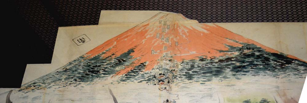 | この絵図を見ている時に「どうして山頂まで道が描かれていないのでしょうか」と疑問が聞かれました。 なるほど、八合目までしか描かれていません。 多分、上吉田地区の絵図なので領域内だけを書いたのではないかと、後になって考えています。 今も八合目から上は浅間大社の領地ですが、当時もそのために、この絵図では八合目までしか描かれていないのかも知れません。 この絵図では山頂右上の白山岳部分が切り取られたようになっていました。 これにも「どうしてでしょうか」と疑問がありましたが、これは全く分かりませんでした。 まだまだこの絵図を見ていると、色々なことが疑問となって湧き出てきます。 そのたびに、過去の資料を調べ、解明していく作業は、大変面白く、興味あることです。 今回公開していただいた志村家に感謝いたします。 (左の絵図の白い斑点も反射で写らなかった部分です) |