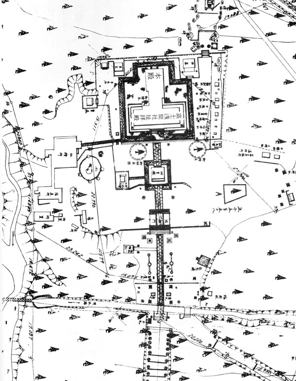 | ところで、この絵図が江戸時代の様子を伝える絵図だと考えられるのは、上左の上浅間境内の様子で推定できます。 その理由は中央下に仁王門があることです。 江戸から明治に入って起こった廃仏毀釈(はいぶつきしゃく)で仏教系の建造物は破壊され、撤去されたのですが、その時仁王門も取り壊されたと言われています。ですから仁王門があるのは江戸時代の絵と言えます。 また、上左の絵図では神楽殿右下の建物の名前が消えていますが、江戸末までここには護摩堂がありました。これも仁王門とおなじく廃仏毀釈で壊されました。 中央左には「鐘楼」が描かれていますが、これも撤去されています。 仏教色はことごとく破壊されるか、撤去されたのですが、現在も残る石灯篭の卍模様はそのまま残っています。 明治維新は富士信仰にとっても大変な変革期だったんですね。 上右図は大正時代頃の浅間神社の見取り図です。仁王門があった位置はこの図の外ですが、護摩堂や鐘楼が無いのは分かります。 |