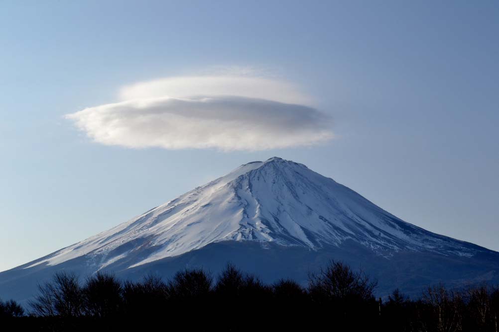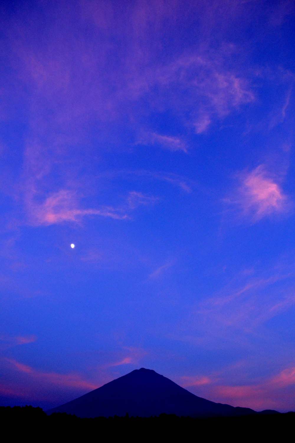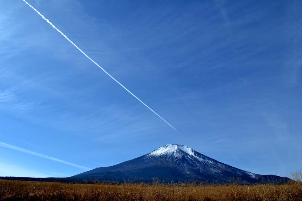 | ←夕やけ雲 富士山に雲はつきものですね。 天気の良い日、夕陽が西の空に沈んだ後、富士山の上空にある雲が真っ赤に染まることがあります。 夕やけです。 赤く染まるのはほんの一瞬です。 しばらくすると、雲はねずみ色になり、やがて夜の闇に融けこむように消えていきます。 夕やけ雲の下の富士山は真っ黒です。 昼間はけっして見せることのない、なんとなく、幻想的な富士山の姿を見せる一瞬です。 ↓飛行機雲 富士山上空は飛行機が頻繁に通過する航路であることはあまり知られていないのではないでしょうか。高度1万m付近を旅客機が数分おき(調べてないのでもう少し少ない回数かも知れません)に行き来しています。 その軌跡がたまにきれいな飛行機雲を見せてくれます。ずーっと見上げているとスーッと移動している飛行機を見つけることができます。 富士北麓上空は羽田から西へ向かう航路になっています。ちなみに逆航路は伊豆上空です。 |