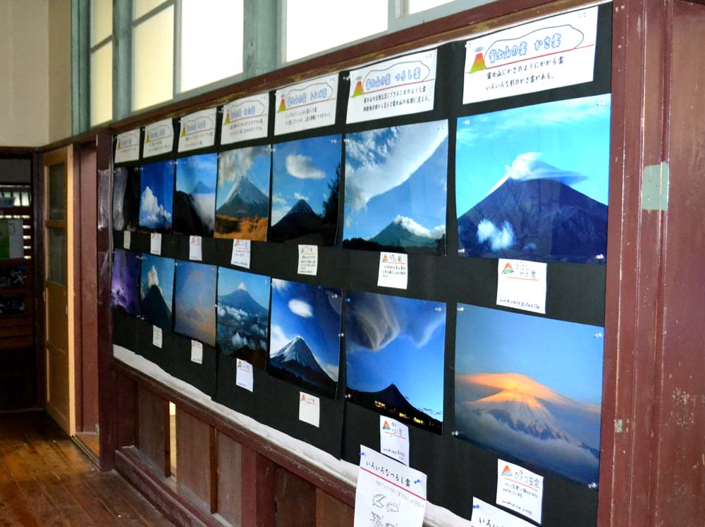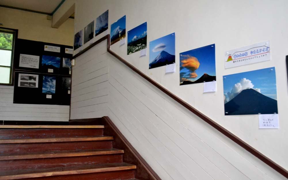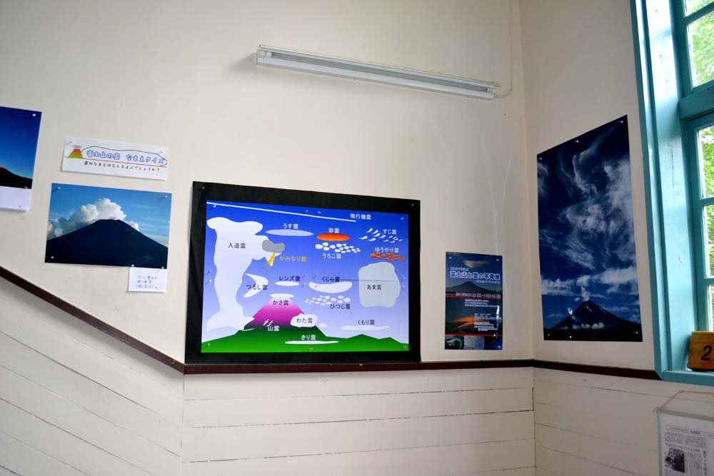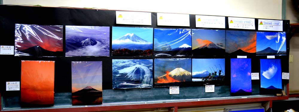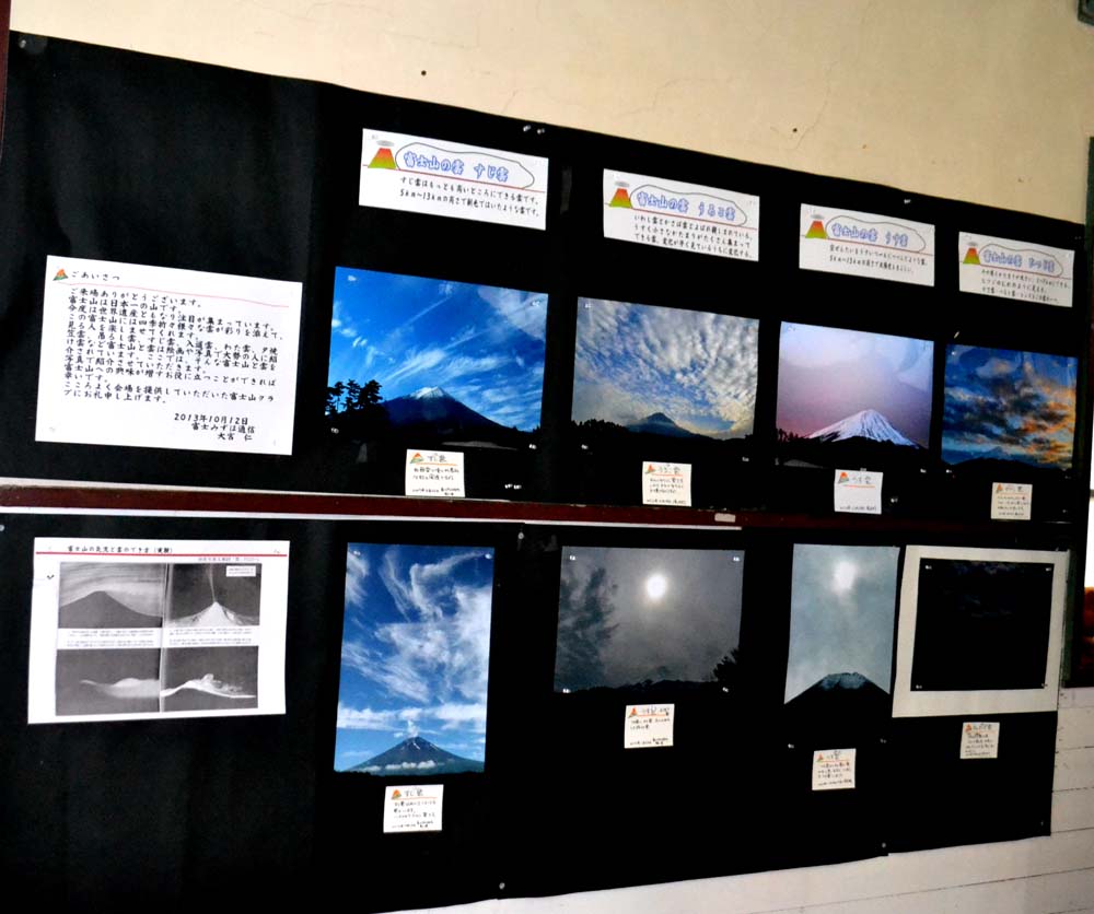 | ←「富士山と雲の写真展」ポスター このような富士山の雲の写真展を富士みずほ通信が山梨県の西湖畔にある富士山クラブもりの学校で開催しています。 ポスターの写真はクジラ雲です。 つるし雲やレンズ雲の一つだと思いますが、ときどき富士山上空に大きな白クジラが出現します。 今回のポスターはその一枚を使ってみました。 「富士山と雲の写真展」ご案内 開催期間 2013年9月12日(木)〜10月29日(火) 場 所 富士山クラブもりの学校 (山梨県富士河口湖町西湖2870) 時 間 9時半〜17時半 休 日 日曜、月曜 (清掃活動などで留守の場合があります。 訪問の場合、事前にお電話で確認をして下さい。) 電 話 0555-20-4600 内 容 富士山と雲を15種類程度の俗称で分類 それぞれを写真で紹介しています。 すじ雲、うろこ雲、うす雲、かさ雲、つるし雲、夕焼け雲、 わた雲、レンズ雲、入道雲、山雲、ひつじ雲など 富士山の雲の名前を当てるクイズコーナーもあります。 富士山クラブでの開催日程 ↓会場の様子 |