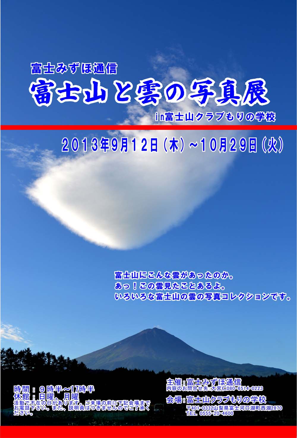 2013年9月12日〜10月29日 西湖畔根場の富士山クラブもりの学校にて 「富士山と雲の写真展」 日、月休み、am9:30〜pm17:30、入場無料 |