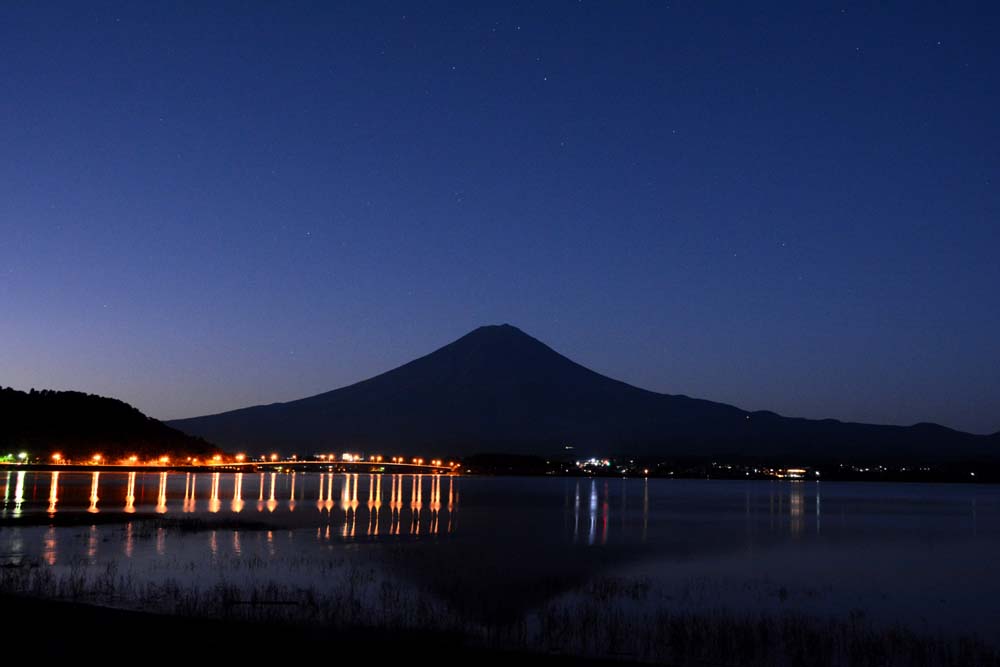 | 10月27日5時15分頃河口湖北岸から、減水していた湖水が元に戻り、湖岸近くまで水面が上がってきました。減水していたときに湖底だったところに育った草が水没して上の方だけ湖面から見えています。河口湖大橋の街灯が湖面に反射して火柱のように見えます。 | |||||||||||||