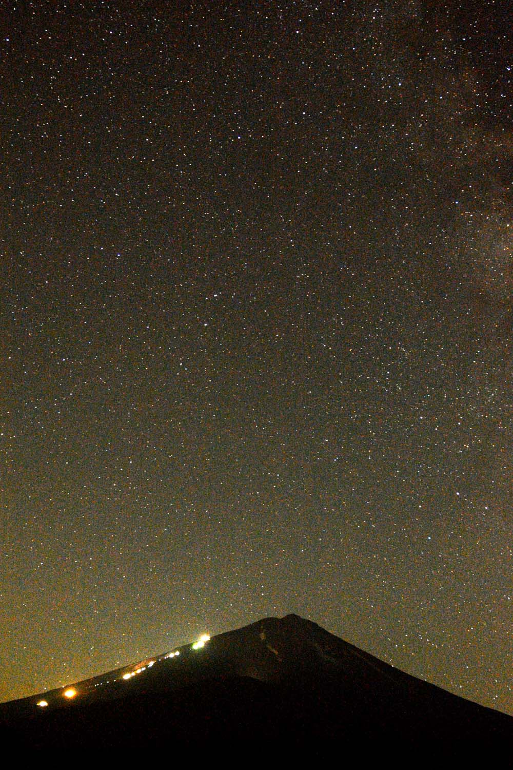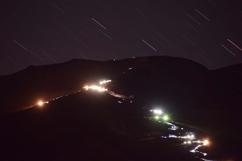 ↓光の帯に満天の星(2014年7月29日、船津から富士登山の灯りと星空)