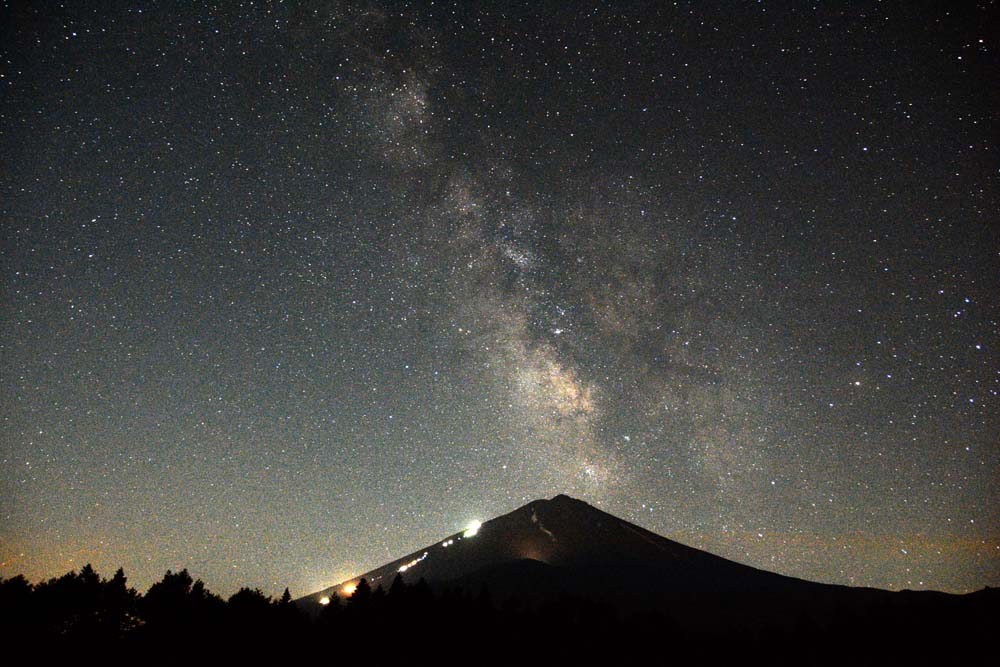 ↓ 富士山頂から立ち上る天の川(2014年7月28日富士林道船津付近から)