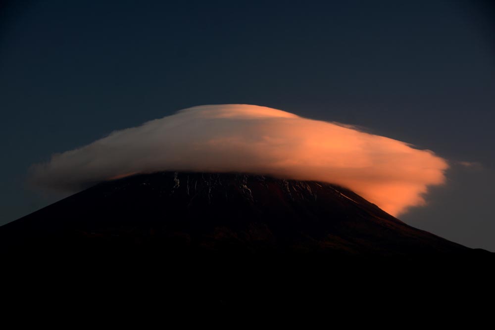 | ↓綿帽子のような笠雲(2014年10月21日、鳴沢から) | |||||||||