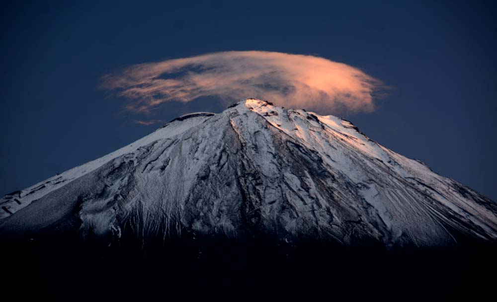 ↓ 富士山頂の笠雲に朝日があたり彩雲笠に(2014年10月3日富士ヶ嶺から) |
