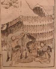 北斎の富嶽百景に画かれているタバコの葉を干す様子と富士の図