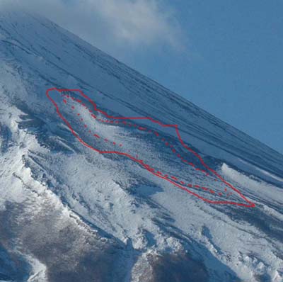 2010年元旦は大晦日からの夜勤明けで、初日の出は見ることができませんでしたが、職場からとりあえず一人で北口本宮富士浅間神社(上吉田の浅間神社)に初詣をすませ、その足で富士山の初撮りをしてきました。典型的な冬型気象なので、富士山には猛烈な西風があたり、上の写真のように山旗雲がはためいていました。空はくっきりと澄み渡り、富士山もご覧のように見事な姿を見せてくれました。 円錐形の斜面は雪が風で飛ばされ、溶岩の肌が透けて見えるほどに薄くへばりついた残雪がまだら模様に残って、早くも雪形観察に絶好の条件になっています。 例年「農鳥」の雪形が現れる八合目付近を見上げると、今年もいました。「鳳凰」がうっすらと飛翔している様子を確認できました。 鳳凰の右隣には「小くじら」、五合目小御岳の左側には「火の玉小僧」の雪形が不十分な形ながら現れはじめていました。しばらく冬型の快晴が続きそうなので、「鳳凰」の飛翔を楽しめそうです。あなたも探してみませんか。あなたのところから見ることができる富士の雪形を。 さて、家族そろっての初詣は、元旦の午後、浅間町の浅間神社に行ってきました。ここは尾曲山(おたれやま)のふもとにある浅間神社で、中腹に忠霊塔があります。富士吉田市街を眼下に見下ろし、富士山を正面に見ることができる富士山撮影スポットとして知られた場所です。参拝客は主に地元の人のようなので、人出は少なく、車を境内に停めて参拝できました。 昨年の暮れは富士吉田市内で2件の火事が相次ぎました。富士見町の火災は午後、子供をサッカーに連れて行った近くだったので、写真下のように間近で火災現場を見てしまいました。空気が乾燥しているので、今のように風が強いと大変な災害につながりかねません。 今年はこのような災害が無い年になって欲しいものです。 また、景気を回復させ、仕事を望む人全てが就労できる社会を実現したいものです。 富士みずほ通信は、今年も皆さんが健康で安心して暮らせるようにお祈りいたします。また、身近な話題を報告していきたいと思っています。今年もどうかよろしくお願いいたします。 〜〜「富士の雪形を楽しもう展」2010年4月〜〜 富士河口湖町図書館にて(予定) |