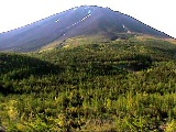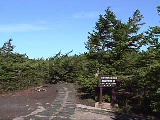 富士山の頂上を眺めると上の写真のようすぐ向こうから木々が途絶え富士山の赤紫の地肌が青空にそびえています。自分が巨人になったような不思議な感覚を覚えます。 | ||
