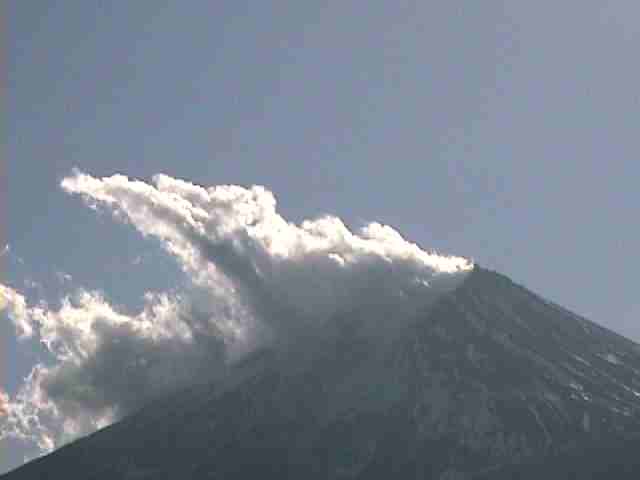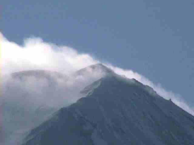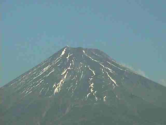 冬の厳しさを象徴するような凛とした富士 富士北麓から見ると左側に 風にたなびく旗のように上空に向かう雲 山旗雲 富士北麓の冬を代表する雲だと思う (撮影場所富士急ハイランドリゾートホテル前) |