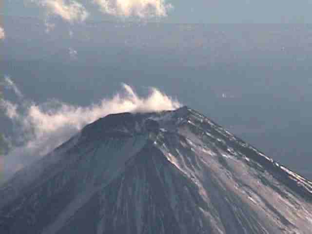 上空から見ると静岡県側に雲がある事が良くわかる。(左1月10日河口湖上空から)この雲を造る強い風のせいか静岡県側は雪が極端に少ない。(右1月12日新幹線富士市あたりから) |